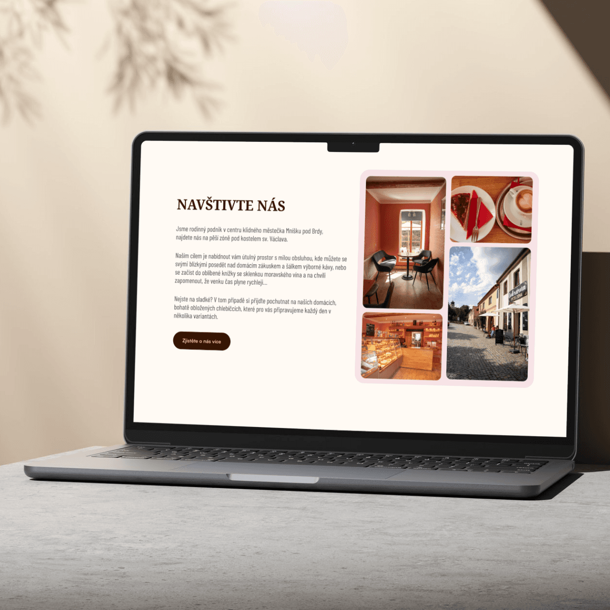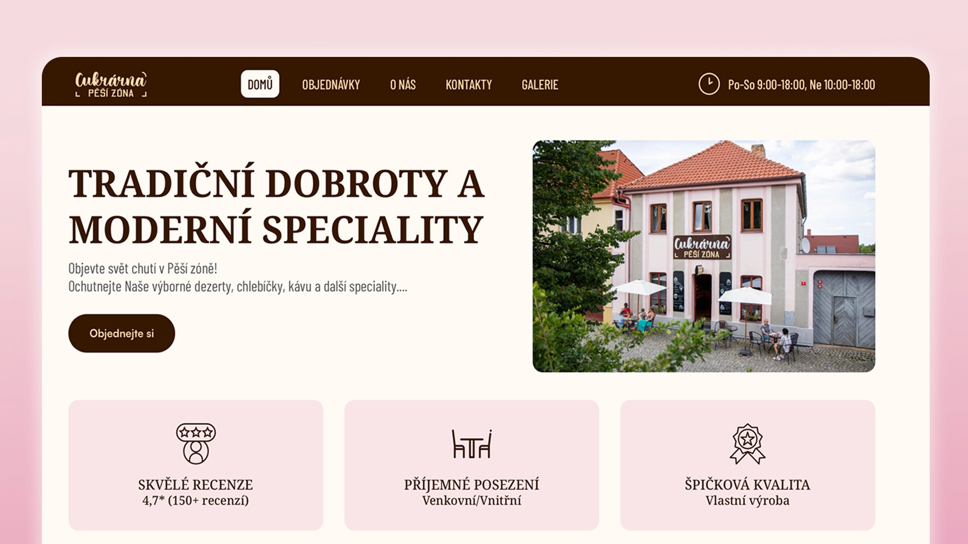 Cukrárna Pěší zóna je milovaný rodinný podnik s velkým srdcem a věrnou klientelou. Přestože jejich vitríny praskají pod návalem skvělých dortů, jejich online prezentace chyběla. Vytvořil jsem pro ně web, který nejen informuje, ale především láká. Cílem bylo přenést atmosféru útulného interiéru a vůni čerstvé kávy do digitálního prostředí a pomoci tak podniku obstát v konkurenčním boji o nové zákazníky.