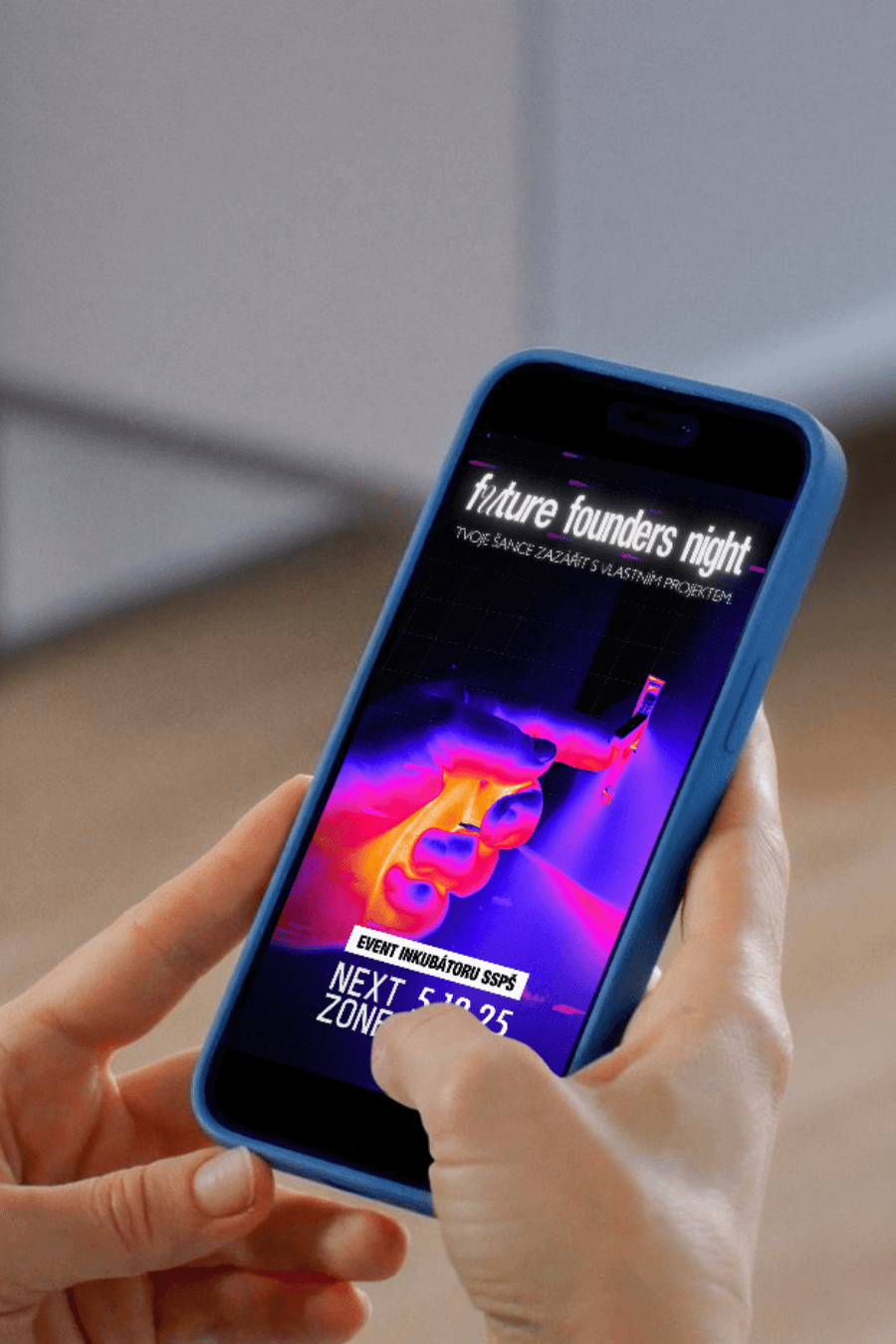 Stylizace: Zvolil jsem heatmap (termokamera) efekt. Kontrast temného pozadí s výraznými neonovými barvami (fialová, oranžová) evokuje energii a teplo lidského dotyku. Tento styl je v současném grafickém designu velmi aktuální a k technologickému zaměření školy i startupů perfektně sedl.