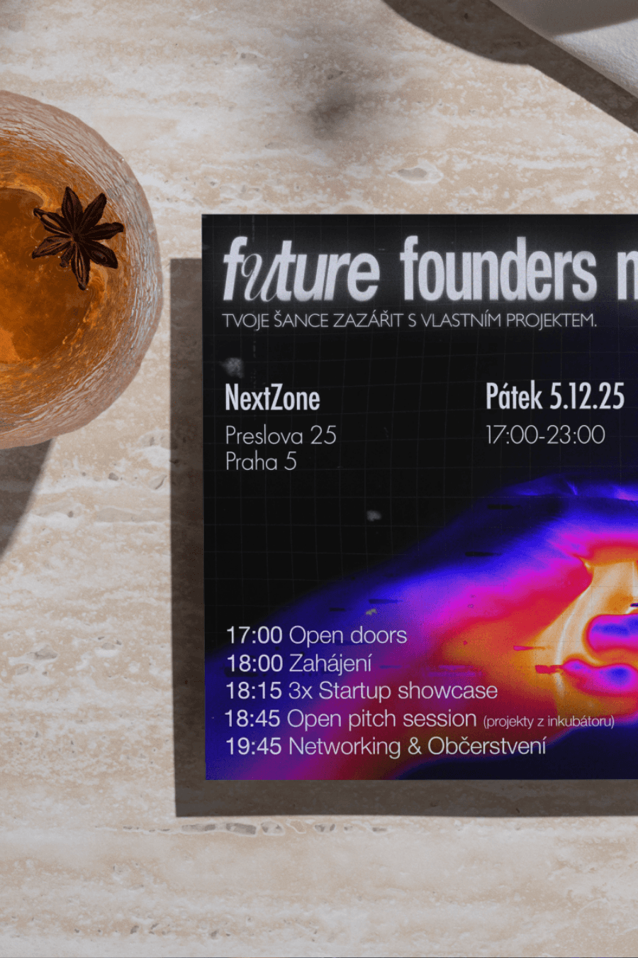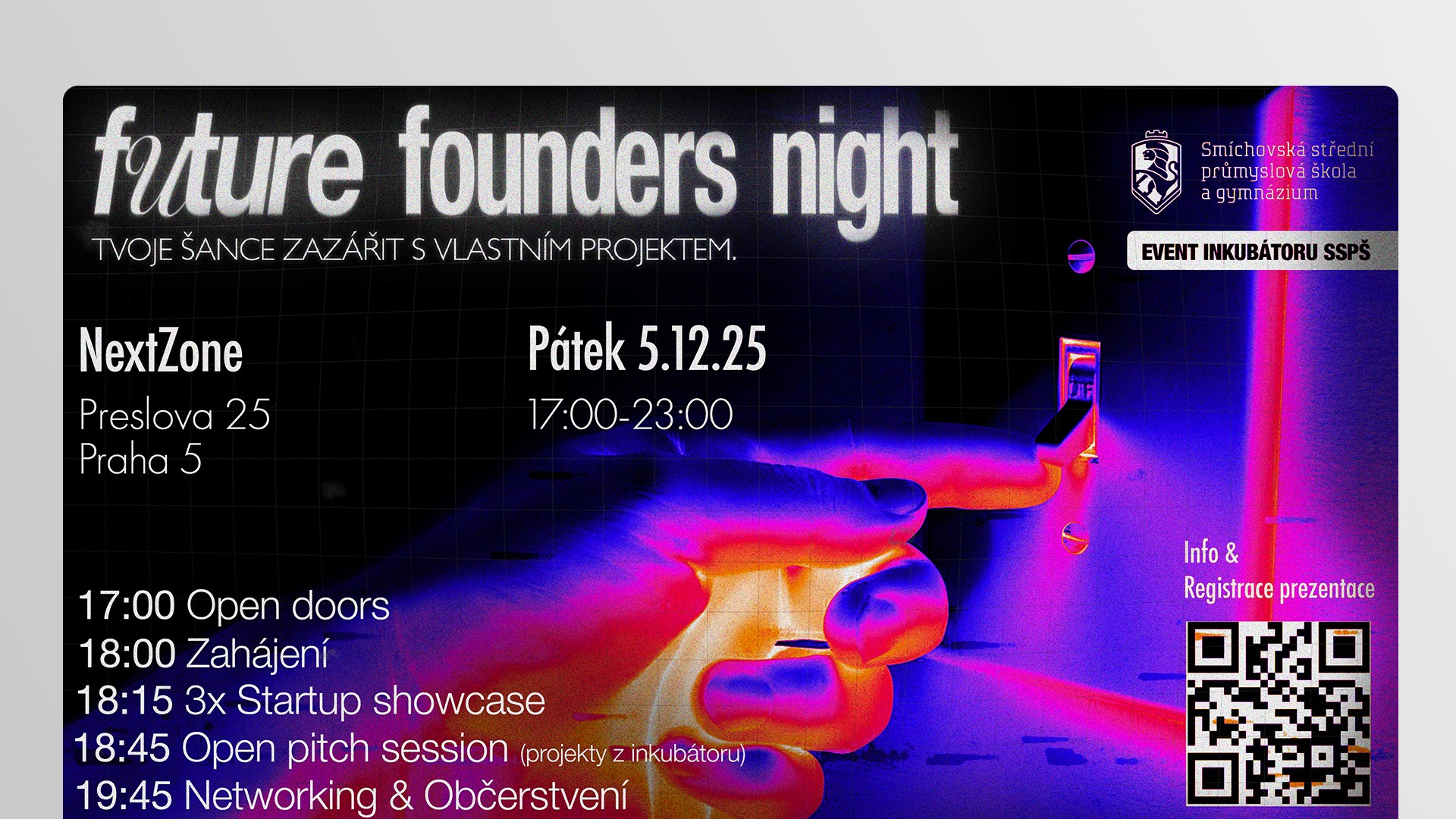 Future Founders Night je klíčová akce Startup inkubátoru Smíchovské střední průmyslové školy (SSPŠ), pořádaná v moderních prostorách NextZone. Je to večer, kdy studenti vystoupí před publikum a prezentují své podnikatelské vize. Mým úkolem bylo připravit kompletní vizuální identitu akce – od grafiky na školní televize až po Instagramové posty a stories, které přitáhnou pozornost studentů a zaplní sál.